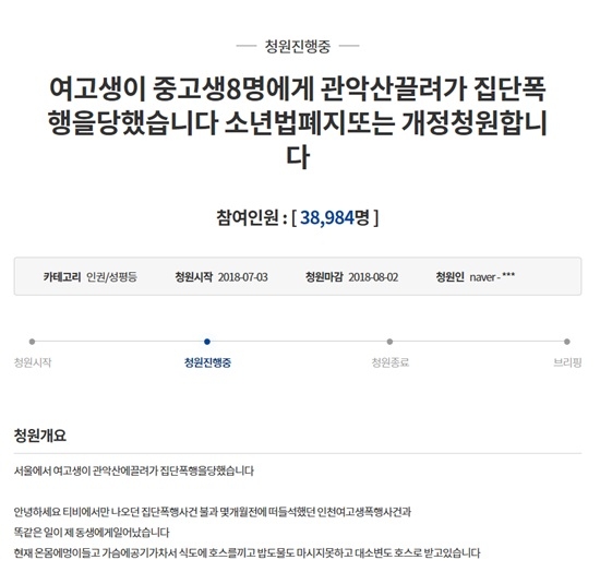 해당 청원글에 따르면, 청원자의 동생인 여고생 A양은 지난달 27일 알고 지내던 또래 여고생과 중고교 선후배 8명에게 서울 관악산으로 끌려가 집단 폭행을 당했다. 이들은 A양의 옷을 벗긴 채 수 시간 동안 각목 등으로 폭행하고 성추행했으며, A양에게 성매매를 강요하기도 했다.