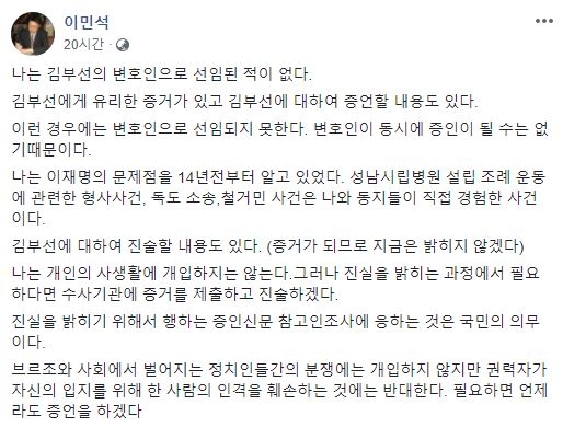 이미지 확대보기30일 이민석 변호사는 자신의 SNS를 통해 "나는 김부선의 변호인으로 선임된 적이 없다"고 밝히며 "김부선에게 유리한 증거가 있고 김부선에 대하여 증언할 내용도 있다"고 말했다.