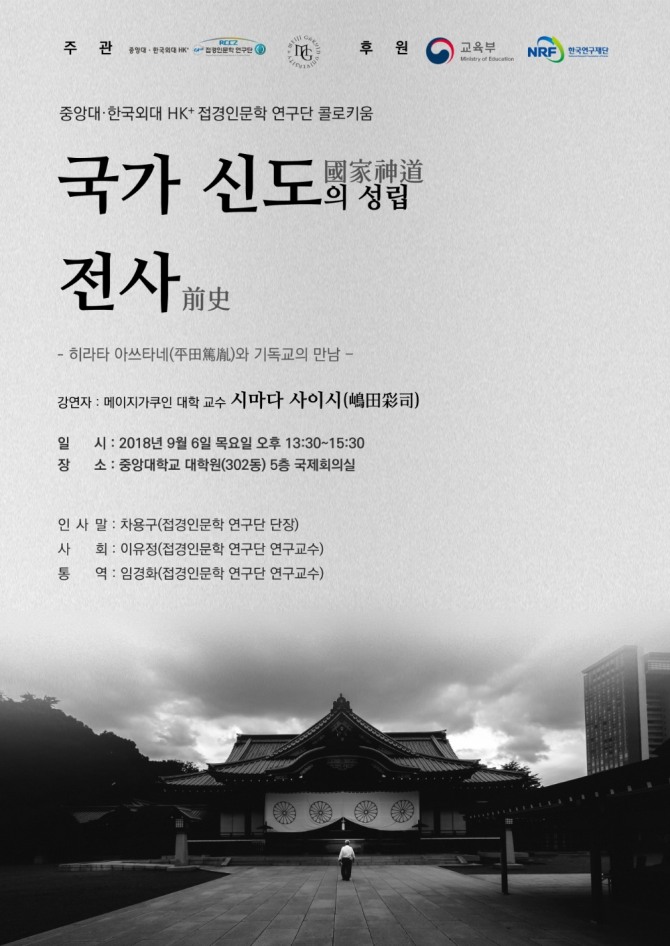이번 콜로키움은 <국가 신도(神道)의 성립 전사(前史) : 히라타 아쓰타네와 기독교의 만남>이란 주제로 시마다 사이시(嶋田彩司, 메이지가쿠인 대학) 교수가 강연할 예정이다. 시마다 교수는 일본 천황제의 버팀목인 ‘신도(神道)’가 ‘종교 위의 종교’로 자리매김한 과정과 신도가 유교, 불교, 기독교 등과 가진 사상적 교류에 대해 다년간 연구해 온 바 있다.