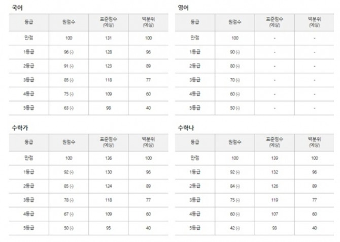 이투스의 고3 실시간 등급컷은 국어 1등급 96점-2등급 91점-3등급 84점, 수학 가형은 1등급 92점-2등급 85점-3등급 77점이다.