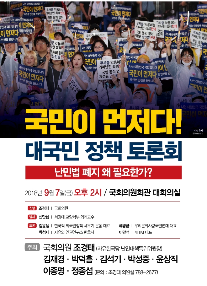 이번 토론회를 주최한 조경태 의원은 “감상적인 난민 포용 정책으로 국민의 안전이 심각하게 위협받고 있다”며 “불법체류자 폭증을 유발하는 무사증입국제도와 득보다 실이 더 많은 난민법을 즉각 폐지해야한다”고 주장했다.