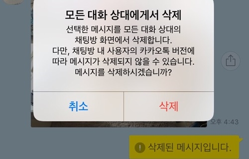이미지 확대보기카카오는 이날 오전 10시부터 카카오톡(카톡) 메시지 삭제기능이 도입됐다고 밝혔다.