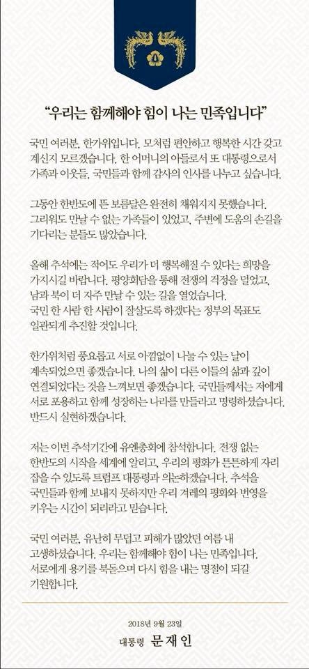 문 대통령은 마지막으로 “저는 이번 추석 기간에 유엔총회에 참석합니다. 전쟁 없는 한반도의 시작을 세계에 알리고 우리의 평화가 튼튼하게 자리 잡을 수 있도록 트럼프 대통령과 의논하겠다”며 “추석을 국민들과 함께 보내지 못하지만 우리 겨레의 평화와 번영을 키우는 시간이 되리라 믿습니다”며 글을 마쳤다.