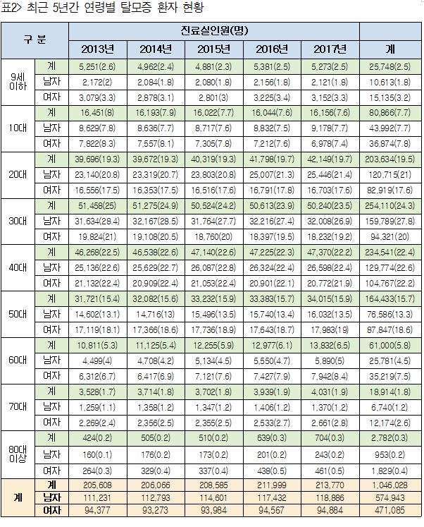지난 5년간 전체 탈모환자 중 45%(47만 1천명)가 여성 환자였으며, 남자 환자는 54.9%(57만 4943명)이었다.
