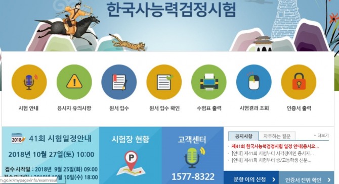 시험 접수는 한국사능력검정 홈페이지를 통해 가능하다. 시험은 오는 27일에 치러지며 11월 9일 합격자가 발표될 예정이다.