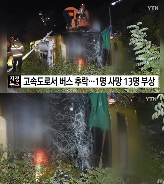 이미지 확대보기도로 위에 떨어진 낙하물을 피하기 위해 고속버스가 언덕 아래로 추락, 50대로 추정되는 1명이 숨지고 13명이 다친 것.