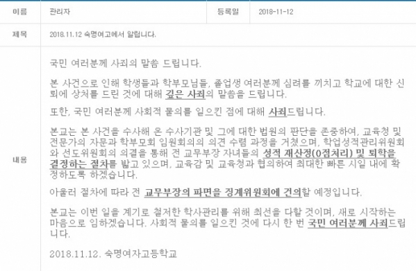 숙명여고는 "이번 일을 계기로 학사관리에 최선을 다할 것이며 새로 시작하는 마음으로 임하겠다"면서 "사회적 물의를 일으킨 데 대해 국민 여러분께 다시 한번 사죄드린다"고 거듭 사과했다.