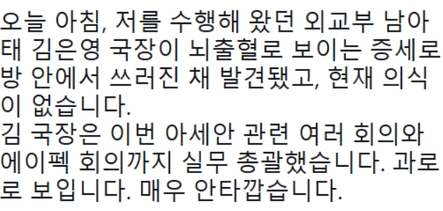 문 대통령은 16일 자신의 페이스북을 통해 "오늘 아침, 저를 수행해 온 외교부 남아태 김은영 국장이 뇌출혈로 보이는 증세로 방 안에서 쓰러진 채 발견됐고, 의식이 없다"고 언급했다.