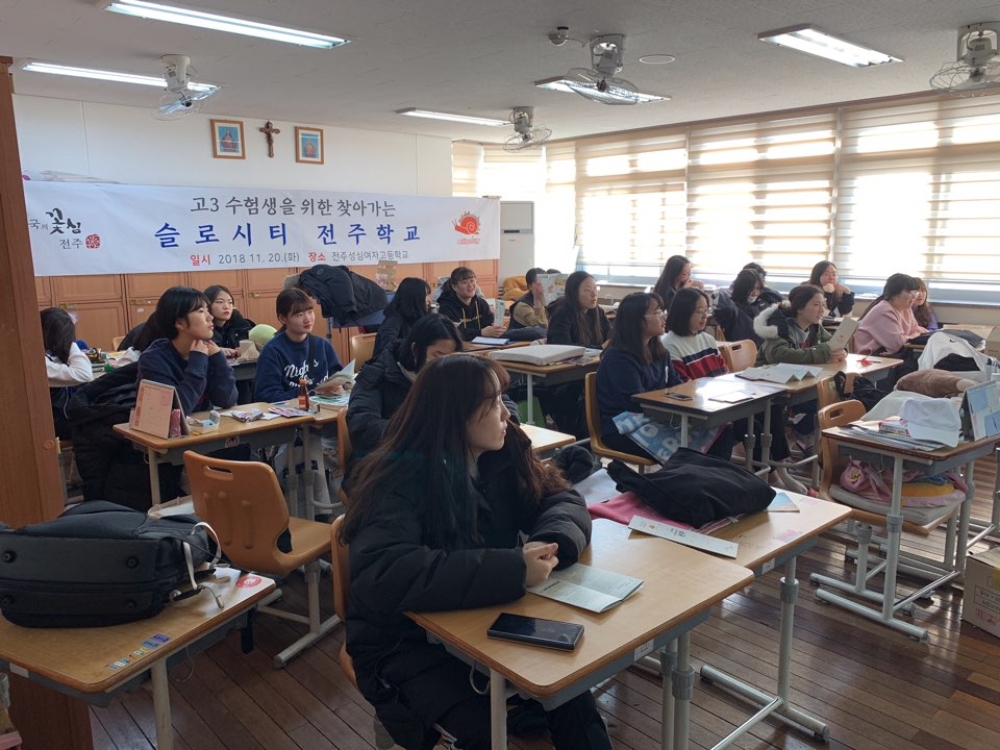 ‘찾아가는 고3 수험생 슬로시티 전주학교’는 학업생활과 수능 준비로 지친 고3 학생들이 도심형 슬로시티 수도인 전주시민으로서 천천히 즐기는 삶의 여유를 느낄 수 있도록 만들기 위해 기획된 것으로, 교육과 전통음악, 전통한지 슬로체험 프로그램 등으로 운영된다.