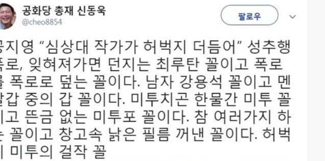 신 총재는 29일 트위터에 "성추행 폭로 잊혀져가면 던지는 최루탄 꼴이고 폭로를 폭로로 덮는 꼴이다. 남자 강용석 꼴이고 멘탈갑 중의 갑 꼴이다“라고 말했다.