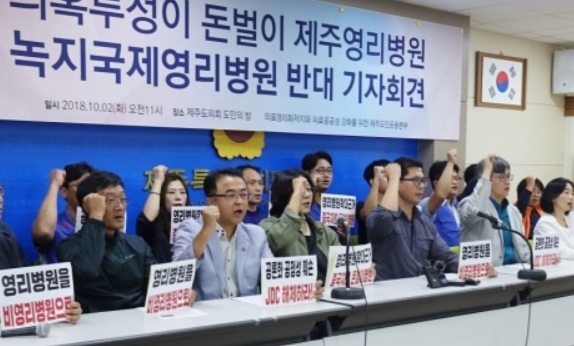 의료연대 제주지부는 “원희룡 지사는 제주도민들을 우롱한 것을 전국민에 사과하고 녹지 국제병원을 불허”하라고 압박했다.