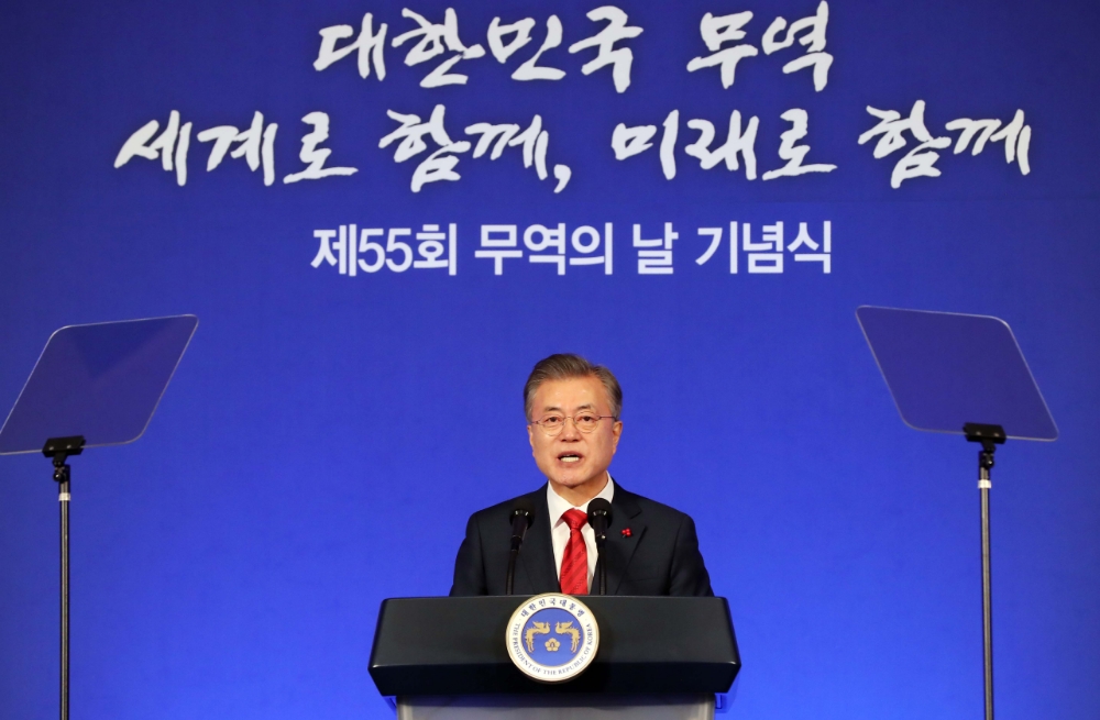 문 대통령은 이날 서울 삼성동 코엑스에서 열린 제55회 무역의 날 축사에서 "올해 우리는 사상 최초로 수출 6000억 불을 달성할 전망"이라며 "인구 27위, 국토면적 107위에 불과한 대한민국이 세계 6위의 수출 강국으로 우뚝 섰다는 것은 참으로 놀라운 성과가 아닐 수 없다"고 했다.