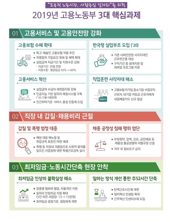 업무보고에 따르면, 고용부는 내년에 '포용적 노동시장 구축'을 목표로 하고 ▲일하는 모든 사람을 위한 고용서비스·고용안전망 강화 ▲직장내 갑질・채용비리 근절 ▲최저임금·노동시간단축 현장안착을 3대 핵심과제로 제시했다.