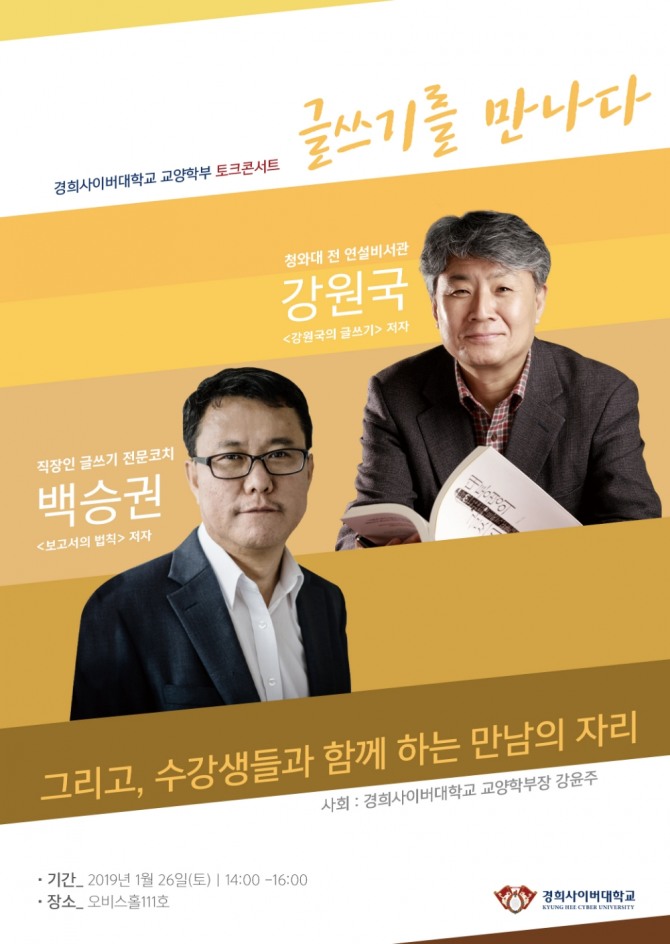이번 토크콘서트는 학생들에게 글쓰기의 철학과 노하우를 전달한 강원국 교수와 백승권 교수와 함께 글쓰기 과제를 첨삭하며 학생들과 소통하는 첨삭지도교수, 글쓰기 과목을 통해 다양한 글쓰기를 경험한 수강생들이 직접 대담을 나눈다.