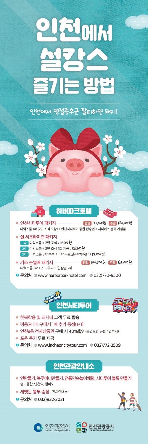 인천시티투어는 설 연휴기간 ▲ 한복착용 및 돼지띠 탑승고객 시티투어 무료 탑승 ▲ 이용권 1매 구매 시 1매 추가 증정(1+1) ▲ 인천e음 전자상품권(舊인처너카드)으로 탑승권 구매 시 본인포함 동반 4인까지 40% 할인 ▲ 황금돼지띠 행운을 미리 점쳐보는 포춘 쿠키 제공 등 다양한 프로모션을 통해 인천 여행에 즐거움을 더해줄 것이다.