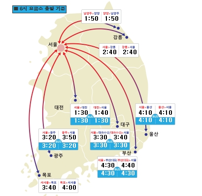 한국도로공사는 6일 전날 오후 11시 출발 기준 부산~서울 요금소는 6시간40분(표 참고)이 걸릴 것으로 예상된다.