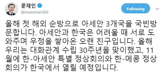 문재인 대통령은 이날 “올해 첫 해외 순방으로 아세안 3개국을 국빈 방문합니다”라며 “11월에 한-아세안 특별 정상회의와 한-메콩 정상회의가 한국에서 열릴 예정입니다”라는 글을 SNS에 올리며 순방 사실을 알렸다.