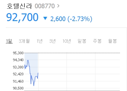 이부진 사장의 호텔신라 주가는 오전 10시 현재 2% 하락, 9만 2700원을 기록하고 있다.