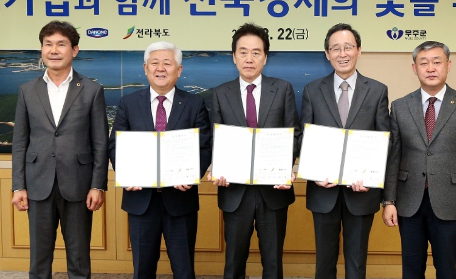 전북도는 22일 도청에서 송하진 전라북도지사, 송성환 전북도의회의장, 황인홍 무주군수, 정희련 풀무원다논 대표이사가 참석한 가운데 풀무원다논 증설투자 협약식을 했다.
