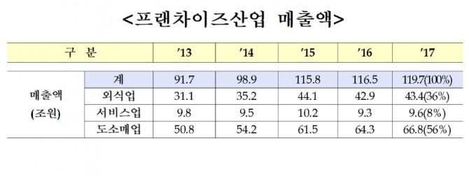 8일 산업통상자원부가 발표한 '2018년 프랜차이즈산업 실태조사'에 따르면 2017년 프랜차이즈산업 매출(가맹본부+가맹점)은 전년의 116조5000억 원보다 2.7% 증가한 119조7000억 원에 달한 것으로 집계됐다.