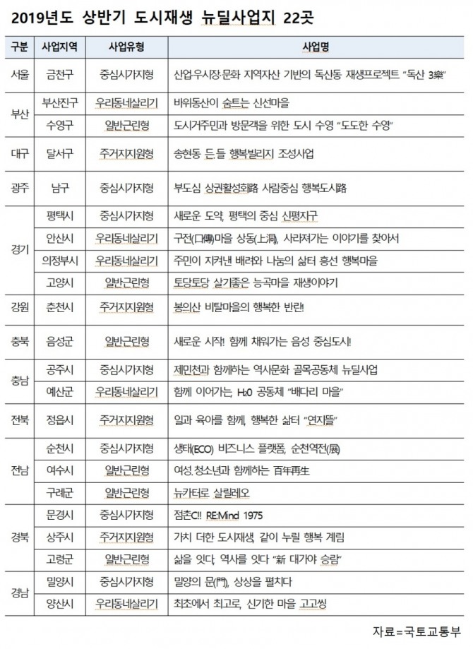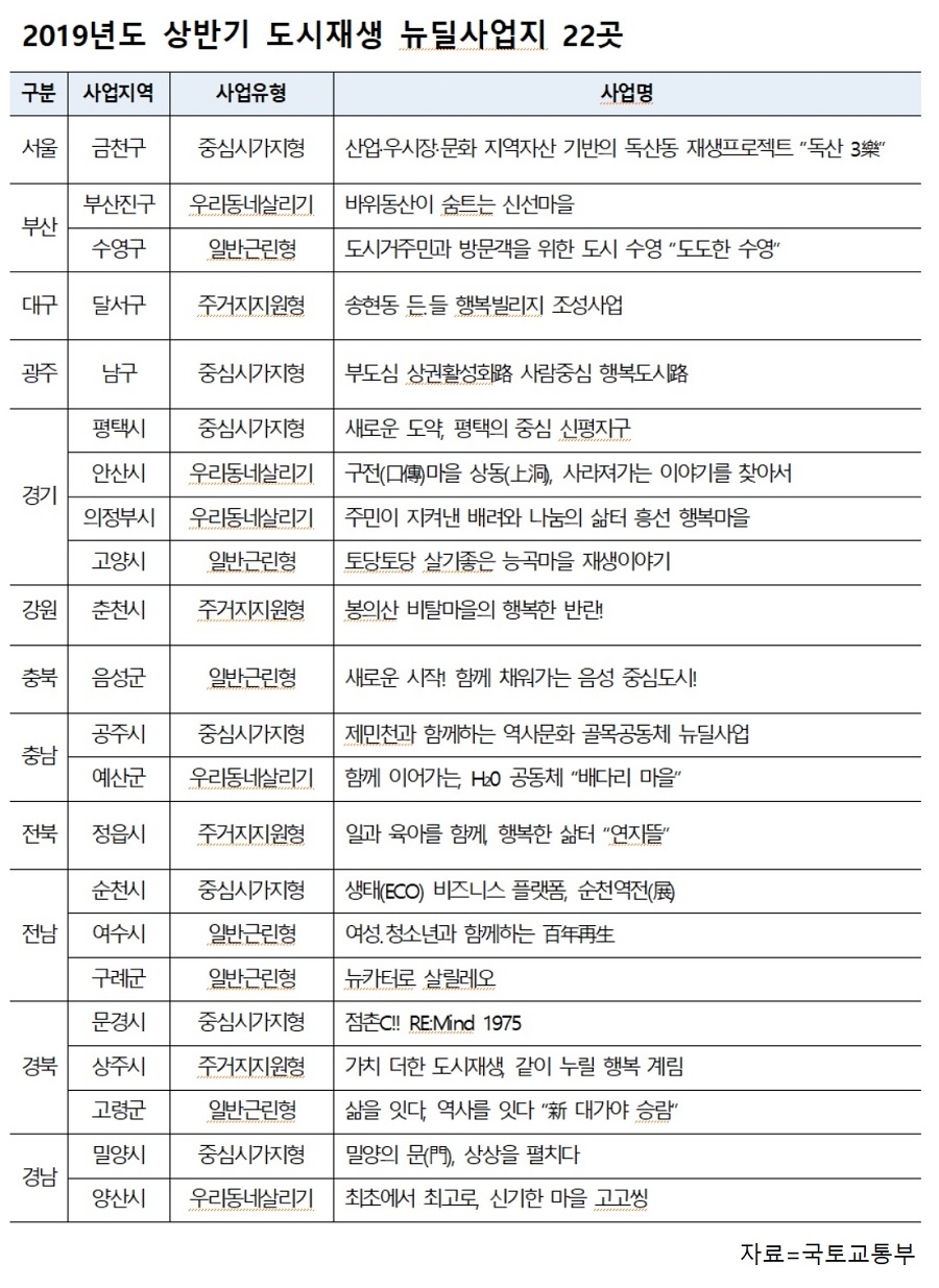 아울러 정부는 올해 도시재생 뉴딜사업지 100개를 목표로 이번에 22개 조기 선정에 이어 나머지 70%는 하반기에 선정할 계획이다.
