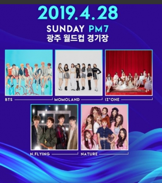 오는 28일 광주 월드컵 경기장에서 열리는 슈퍼콘서트는 방탄소년단과 트와이스, 모모랜드, 아이즈 원, 홍진영, 엔 플라잉, 네이처, 더보이스, TXT, 체리블렛 등이다.