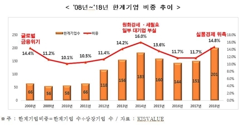 이같이 이자보상배율이 1 미만인 한계기업 비중은 전년보다 3.1% 포인트 상승, 2014년의 16% 이후 가장 높은 것으로 나타났다.