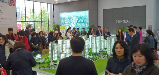청약을 위해 '화성 우방 아이유쉘 메가시티' 견본주택을 둘러보고 있는 방문자들. 사진=SM그룹