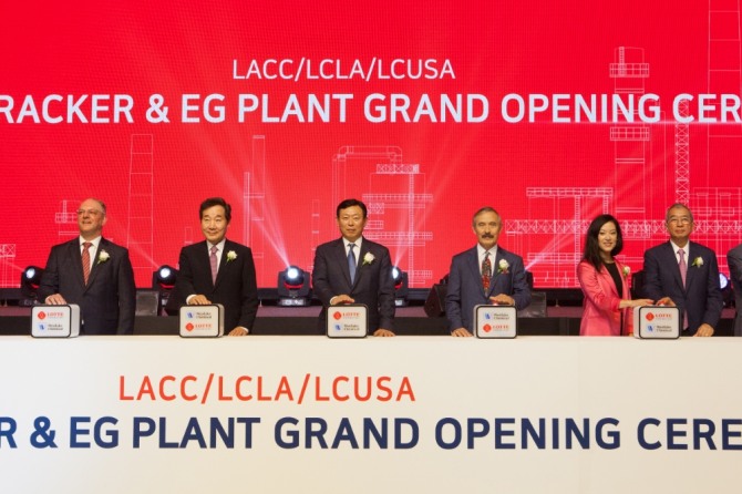 롯데케미칼은 9일(현지시간) 루이지애나주 레이크찰스에서 '에탄크래커(ECC) 및 에틸렌글리콜(EG) 공장 준공식'을 진행했다.