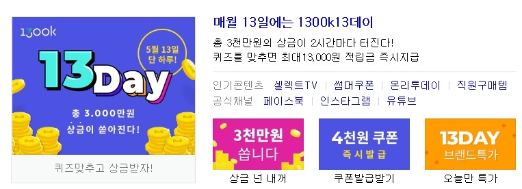 5월 13데이 혜택을 받으려면 네이버에서 ‘1300k 13데이’를 검색해 이벤트에 접속하면 받을 수 있다.