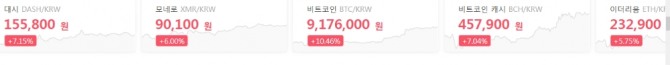 이더리움은 12% 상승 1만 2300원, 리플은 4% 올라 389원, 비트코인 캐시는 7% 올라 45만 7000원이다.