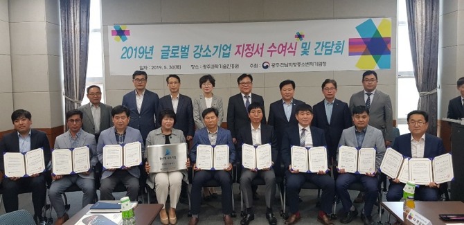 이미지 확대보기30일 광주·전남지방중소벤처기업청(청장 이재홍, 이하 광주‧전남중기청)에 따르면 이날 광주과학기술진흥원에서 19년 글로벌 강소기업으로 지정된 지역 수출 중소기업 10개사에 지정서와 현판을 수여했다.