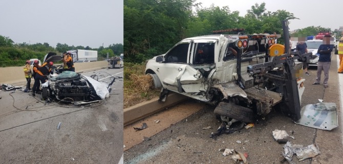 이미지 확대보기택시기사 A(72)씨와 부인 B(62)씨는 그 자리에서 숨졌으며, 뒷좌석에 탄 A씨의 여동생 C(62)씨도 다쳐 119구급대에 의해 병원으로 이송돼 병원에서 치료를 받고 있는 중이다.