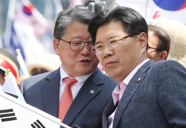 이미지 확대보기자유한국당 홍문종(오른쪽) 의원이 15일 오후 서울 용산구 서울역광장에서 열린 태극기집회에서 대한애국당 조원진 대표와 대화를 나누고 있다. 이날 홍문종 의원은 태극기 집회에서 탈당 선언을 한 후 대한애국당 조원진 대표와 함께 '신공화당'을 만들기로 발표했다. /뉴시스