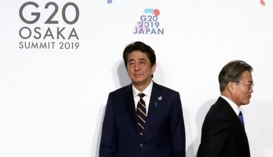 문재인 대통령이 지난달 28일 일본 오사카에서 열린 G20 정상회의 공식환영식에서 의장국인 일본 아베 신조 총리와 악수한 뒤 행사장으로 향하고 있다.