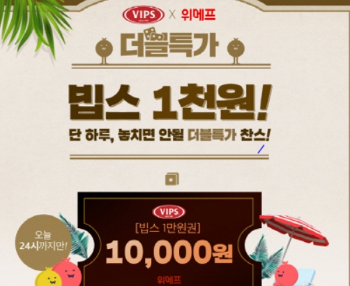 이른아침 위메프가 평일 주말관계 없이 빕스를 1000원에 먹을 수 있는 '더블특가'를 실시에 18일 포털을 달구고 있다..
