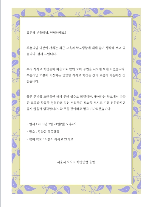 초대장에는 자사고 안에서 학생들이 다양한 교육과 활동을 하고 있으며, 학생과 학부모들을 만나 자사고가 입시위주 교육만 하는 것은 아니라는 것을 알려준다는 내용이 담겼다.