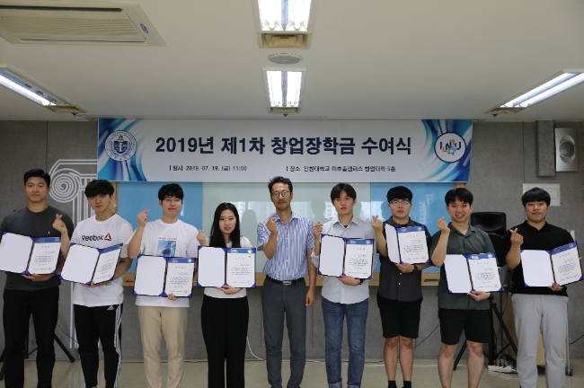 이날 진행된 창업장학금 수여식에서는 인천대학교 창업지원단 김관호 단장과 창업장학금을 지원받게 된 인천대학교 학생 9명이 참석하였고, 가장 높은 점수를 받은 정다원 학생(인천대, 창의인재개발학과)을 비롯하여 참석자 전원에게 100만원(총 900만원)의 창업장학금 및 장학증서를 수여했다.