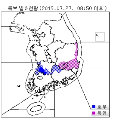 토요일인 27일 장마전선의 영향으로 오후에는 전국에 걸쳐 천둥 번개를 동반한 소나기기 내릴 전망이다.o 호우경보 : 전라북도(순창, 정읍)