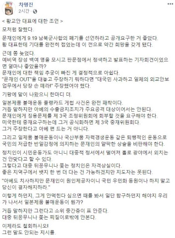다만 "문재인에 대한 책임 추궁이 빠진 게 결정적으로 아쉽다"며 "'대국민 사과하고 일체의 외교안보업무에서 당장 손 떼라'고 주장했어야 했다"고 덧붙였다.
