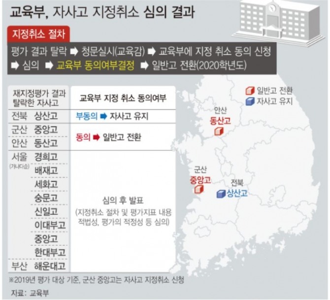 교육부 동의로 지정 취소된 서울지역 자사고는 경희·배재·세화·숭문·신일·중앙·이대부고·한대부고 8곳이며, 경문고는 스스로 일반고 전환을 신청했다. 부산은 해운대고 1곳이다.
