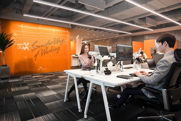 서울 센트로폴리스 빌딩 내 5G 스마트오피스에서 모바일 VDI 서비스를 시연하는 모습. (사진=SKT)