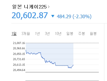 일본증시는 2.3%(491포인트)떨어져 2만 595를 기록하고 있다.