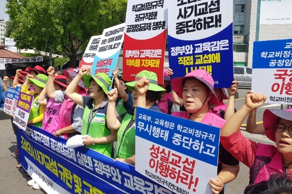 학비연대는 "심지어는 교섭위원 중 한 명이 학교 비정규직은 일하는 것에 비해 월급이 적은 게 아니라는 막말도 했다"며 "더 이상 농락과 기만을 일삼는 사용자와 교섭을 할 수 없다"고 말했다.