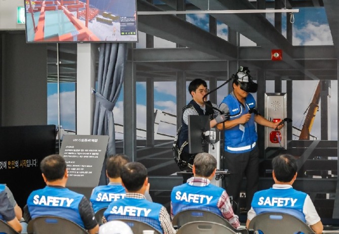 대림산업의 협력업체 대표들이 강사의 안내를 받아 VR(가상현실) 안전 체험 교육을 받고 있다. 사진=대림산업