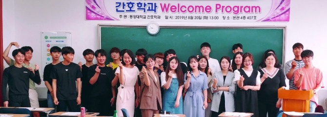 이미지 확대보기동강대학교(총장 이민숙) 간호학과(학과장 정인주)는 최근 본관 4층에서 1~4학년 복학생을 대상으로 ‘2019학년도 2학기 간호학과 Welcome Propgram’을 진행했다. /동강대학교=제공 동강대학교(총장 이민숙) 간호학과(학과장 정인주)는 최근 본관 4층에서 1~4학년 복학생을 대상으로 ‘2019학년도 2학기 간호학과 Welcome Propgram’을 진행했다.