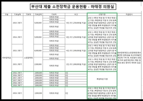 바른미래당 하태경 의원이 28일 부산대로부터 제출받은 '소천장학회 운용현황'에 따르면 소천장학회는 2016년부터 3년간 조씨에게 장학금을 지급하면서 장학생 선정기준을 '특정학생 지명'이라고 적시했다.