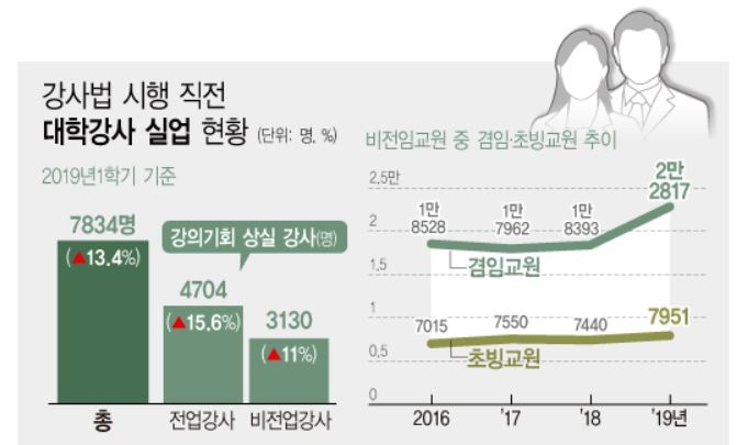 저출산으로 인한 학령인구 감소로 대학생 수가 줄어듦에 따라 올해 전임교원과 다른 형태의 비전임교원 수는 대부분 감소했다. 결국 강사법에 대비해 기존 강사에게 배정하던 강의를 겸임·초빙교수로 대체된 것으로 보인다.