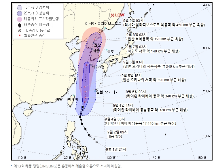 ○ 제13호 태풍 '링링(LINGLING)'의 발달과 북상속도에 따라 우리나라가 태풍 영향권에 드는 시점이 달라질 수 있으니, 앞으로 발표되는 기상정보와 태풍정보를 참고하기 바랍니다.