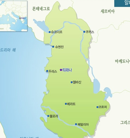 정식 명칭은 알바니아공화국(Republic of Albania)이며, 알바니아인(人)은 '슈키퍼리아'(독수리의 나라)라고 부른다. 발칸 제국 중에서 작은 나라의 하나로, 동쪽으로 마케도니아, 남쪽으로 그리스, 서쪽으로 아드리아해(海), 북쪽으로 몬테네그로, 북동쪽으로는 세르비아의 코소보메토히야 자치주, 남서쪽으로 이오니아해에 면한다.